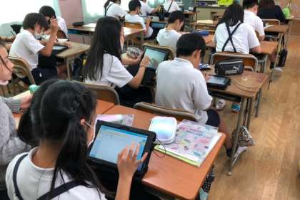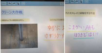 6年生の家庭科では、クリーン大作戦の学習をしています。タブレットで教室の中の気になるところを撮り、どんなふうに掃除すればいいかを考えました。