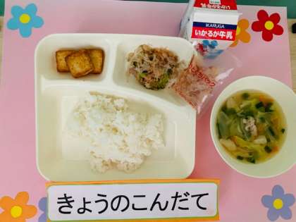 ゴーヤチャンプルー、すまし汁、あつあげのしょうがじょうゆかけ、ごはん、牛乳