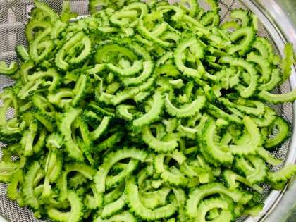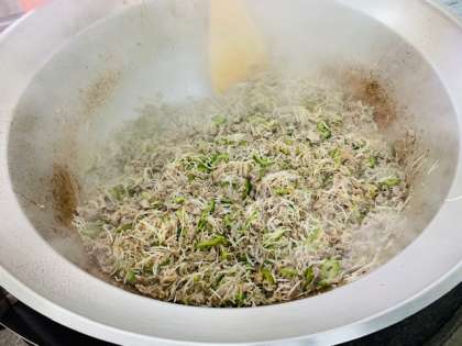 給食室でゴーヤチャンプルーを作っているようすです。豚肉、にがうり、もやしの順にいため、味付けをします。小袋のかつおぶしをかけて食べます。