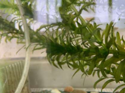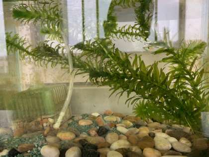 5年生は理科で「メダカのたんじょう」の学習をします。そのため各学級でメダカを飼育しています。少しわかりにくいですが、水草に卵がくっついています。