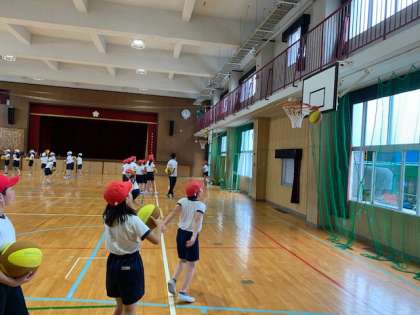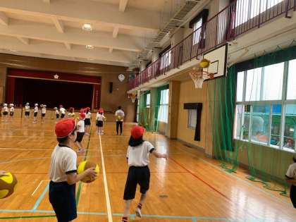 今日も雨が降っていて運動場は使えませんが、講堂では5時間目に5年1組が体育科の授業でバスケットボールの練習をしました。みんなとても楽しそうにきびきびした動きで、シュート練習に取組んでいました。