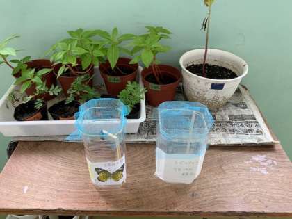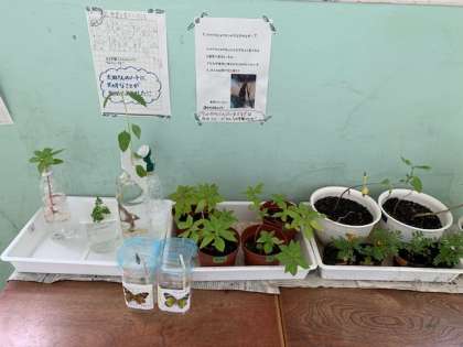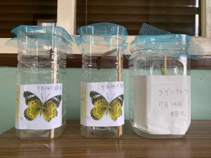 地域の方から学習に役立ててほしいとツマグロヒョウモンとアゲハチョウのさなぎをいただきました。ツマグロヒョウモンのさなぎをよく見ると、金色に光る突起があります。しかし、なぜ金色に光るのかはわからないそうです。