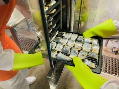 給食室でさごしの塩焼きを作っているようすです。料理酒と塩でさごしに下味をつけ、網の上に並べます。さらに塩をふり、焼き物機で焼きます。
