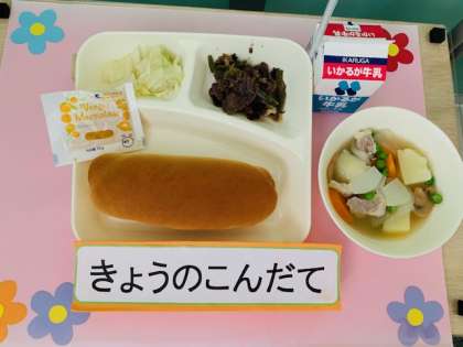 牛肉の香味焼き、スープ煮、サワーキャベツ、コッペパン、マーマレード、牛乳