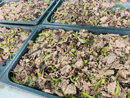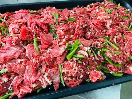 給食室で牛肉の香味焼きを作っているようすです。牛肉に下味をつけ、ピーマンと混ぜ合わせホテルパン(鉄板)に入れ、焼き物機で焼きます。