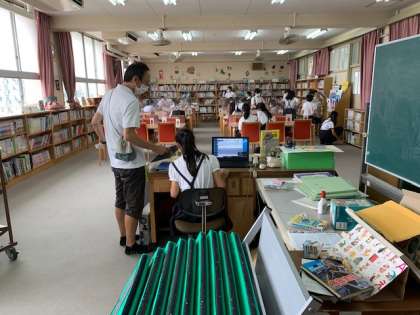6年生の授業のようすです。1組は図書、2組は図工をしました。みんなとても楽しく授業に取組んでいました。