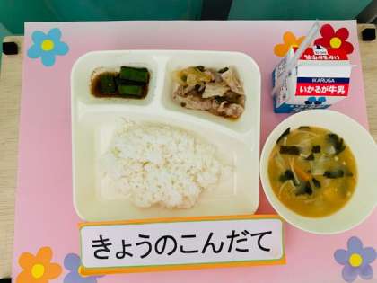 豚肉の甘辛焼き、みそ汁、オクラのおかかいため、ごはん、牛乳