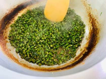 給食室でオクラのおかかいためを作っているようすです。オクラと粉末のかつおぶしをいためています。