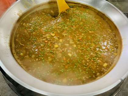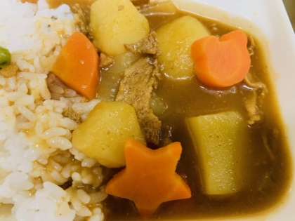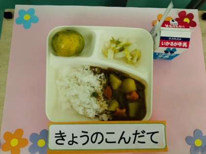 今日のポークカレーライスは、小麦アレルギーの児童も食べることができる米粉のカレールウを使用しています。ラッキーにんじんが入っています。