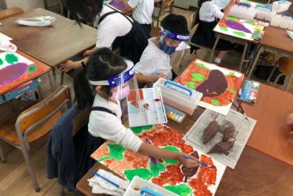 2年生の図工のようすです。おいもの絵が完成に近づいています。
