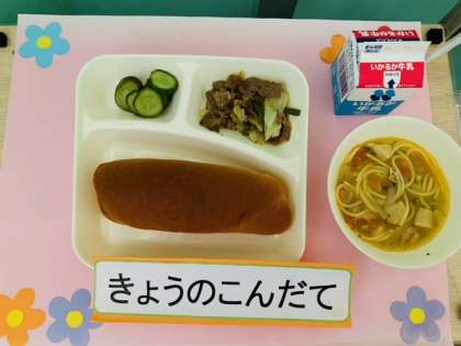 牛肉のカレー風味焼き、ほたて貝とトマトのスープスパゲッティ、黒糖パン、牛乳