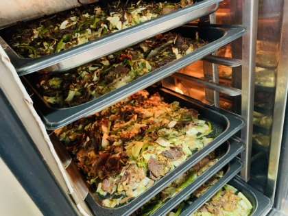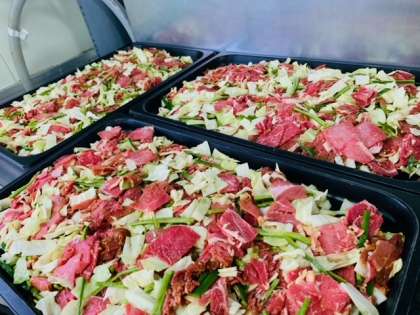 給食室で牛肉のカレー風味焼きを作っている様子です。牛肉にワイン、塩、こしょう、カレー粉、油で下味をつけます。下味をつけた牛肉、キャベツ、ピーマンを混ぜ合わせ、ホテルパン(鉄板)に入れて焼き物機で焼きます。