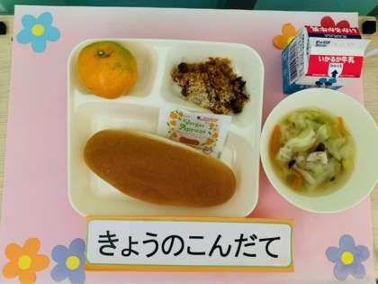 なすのミートグラタン、鶏肉と野菜のスープ、みかん、コッペパン、アプリコットジャム、牛乳