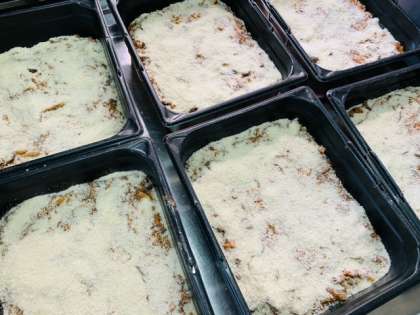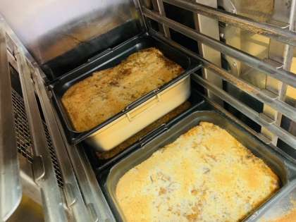 給食室でなすのミートグラタンを作っているようすです。粉末チーズではなくパン粉をかけて焼いているので、乳アレルギーの児童も食べることができる献立です。
