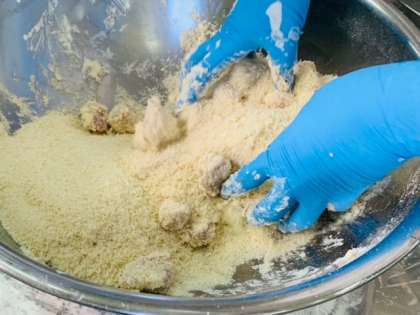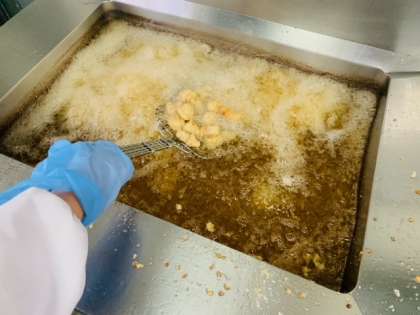 給食室でみそカツを作っているようすです。下味をつけた豚肉に衣とパン粉をつけて、あぶらであげた手作りのカツです。