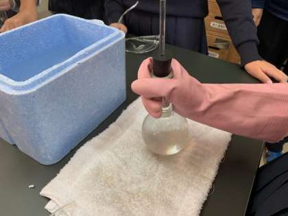 4年生は理科の「もののあたたまり方」の単元で、ものの温度と体積の学習をしています。今日は実験をしました。