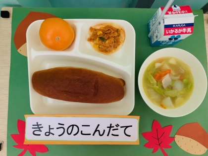 豚肉と野菜のスープ煮、変わりピザ、みかん、黒糖パン、牛乳