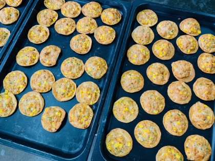 給食室で変わりピザを作っているようすです。ツナ、コーン、ピーマン、ピザソース、チーズを混ぜ合わせて具を作ります。ぎょうざの皮を並べて具をのせ、焼き物機で焼きます。