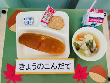 とうふハンバーグ、カリフラワーのスープ煮、固形チーズ、おさつパン、牛乳