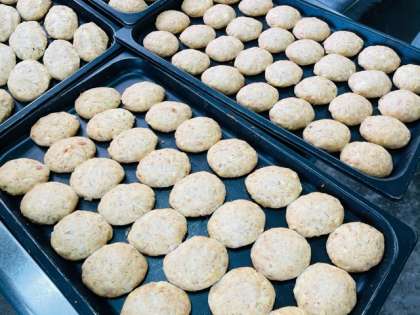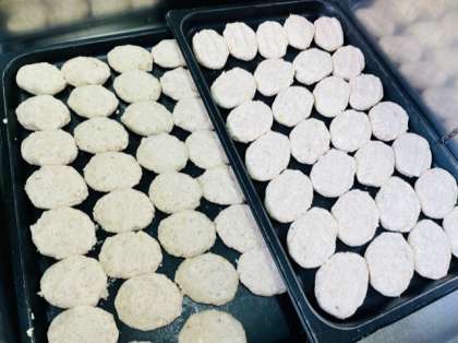 給食室でとうふハンバーグを作っているようすです。ツナ、でん粉、たまねぎ、砂糖、塩、こいくちしょうゆ、とうふを混ぜて形をつくり、焼き物機で焼きます。ひとつずつ手作りしています。