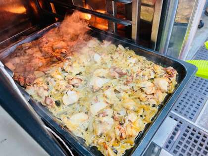 給食室で鶏肉の甘辛焼きを作っているようすです。
