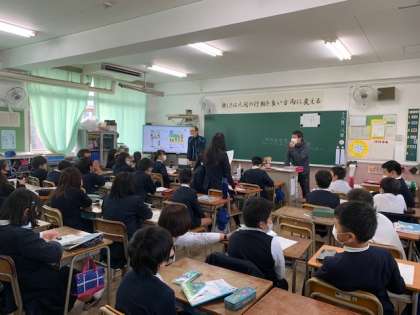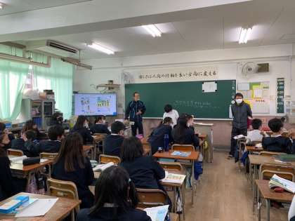 6年生の英語の授業のようすです。児童が都道府県の特徴を英語で出題し、先生が答えるクイズをしました。