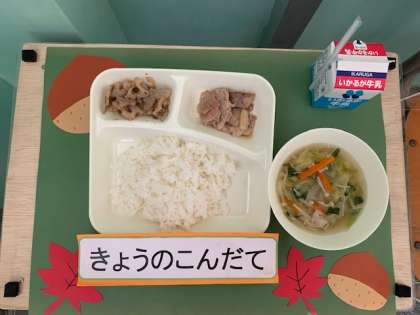 豚肉のねぎじょうゆ焼き、れんこんのおかかいため、すまし汁、ごはん、牛乳