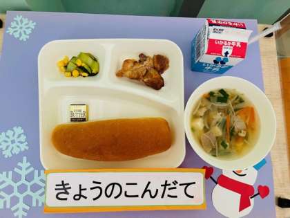 鶏肉のオイスターソース焼き、中華スープ、チンゲンサイとコーンの中華あえ、コッペパン、バター