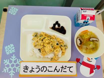 親子丼、すまし汁、黒豆の煮もの、牛乳