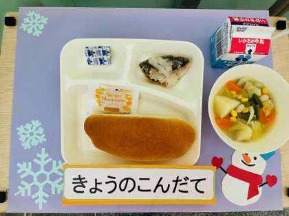あじのレモンマリネ、てぼ豆のスープ煮、固形チーズ、コッペパン、マーマレード、牛乳