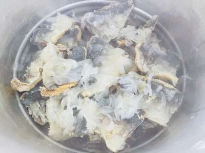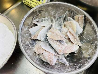 給食室であじのレモンマリネを作っているようすです。あじに塩、こしょうで下味をつけでん粉をまぶし、油であげます。レモン汁を加えて作ったマリネ液をかけます。