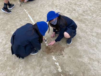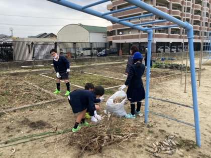 運動委員会は運動場の古くなったラインテープのはり替え作業をしています。また、栽培委員会は畑の雑草を抜いています。