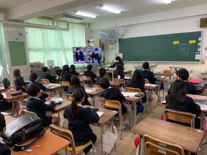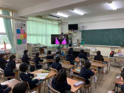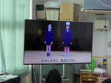 今日の児童集会は、集会委員会の児童による「ピーチボーイ(桃太郎)」をビデオ放送しました。各教室では、集会委員会のみなさんの熱演にとても盛り上がっていました。