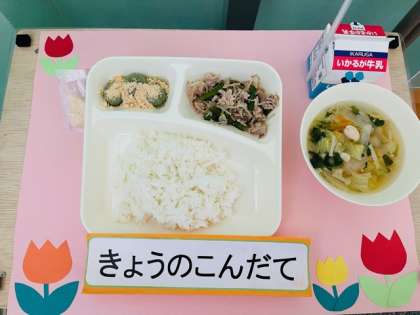 豚肉と野菜のいためもの、すまし汁、きな粉よもぎだんご、ごはん、牛乳