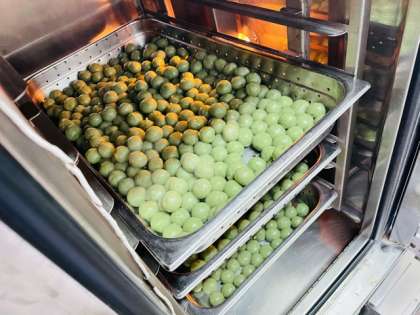 給食室できな粉よもぎだんごを作っているようすです。よもぎだんごを焼き物機で蒸し、砂糖、うすくちしょうゆ、でんぷんで作ったタレと合わせます。きな粉をかけて食べます。