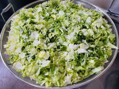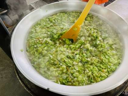 給食室でレタスのスープを作っているようすです。ウインナー、レタス、にんじん、パセリが入っています。