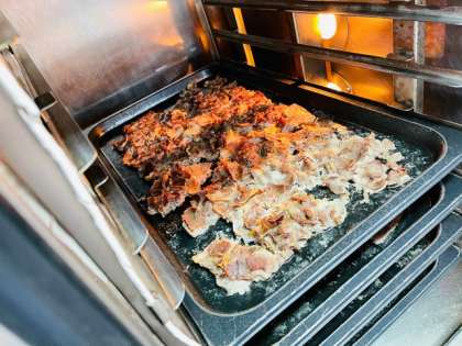 給食室で豚肉のデミグラスソースを作っているようすです。ワイン、塩、こしょう、オリーブ油で下味をつけた豚肉を、焼き物機で焼きます。りんごピューレ、デミグラスソール、ウスターソース、ケチャップを合わせたソースを焼いた豚肉にかけます。