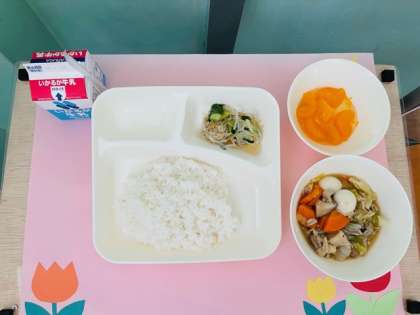 八宝菜、チンゲンサイともやしのしょうがあえ、みかん(かんづめ)、ごはん、牛乳