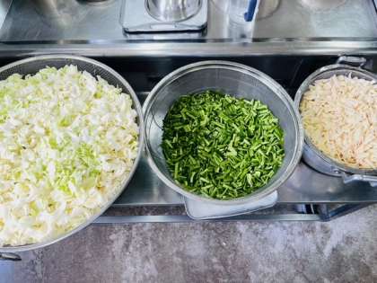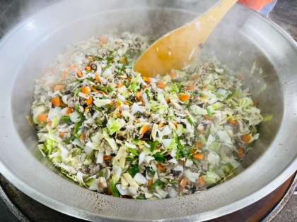 給食室で八宝菜を作っているようすです。豚肉、うずら卵、たまねぎ、キャベツ、にんじん、たけのこ、ピーマン、しいたけが入っています。