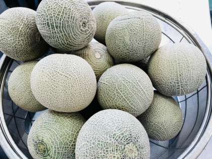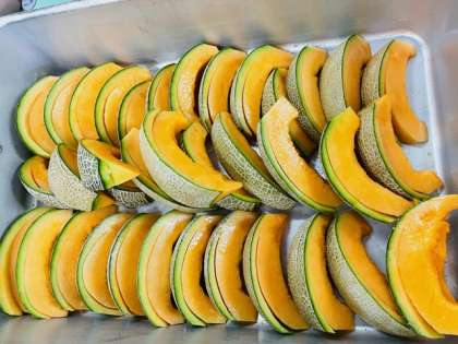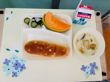 かぼちゃのクリームシチュー、ミックス海そうのサラダ、クインシーメロン、おさつパン、牛乳