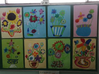色鮮やかなお花たちが元気よくカラフルな花瓶にいけてあります。