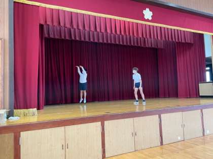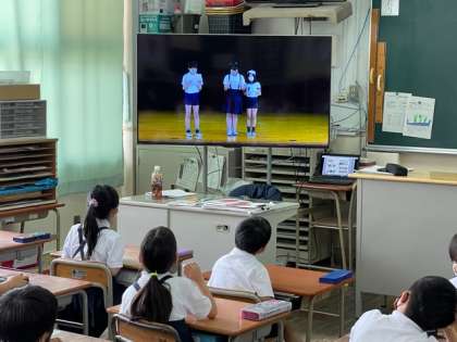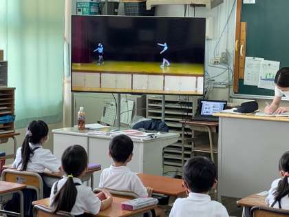 今日は「ジェスチャーゲーム」です。集会委員会の皆さんがスポーツ競技のジェスチャーをして、教室の子どもたちが答えていました。