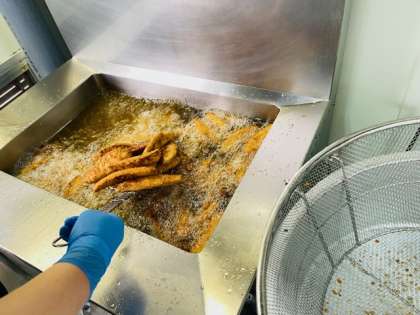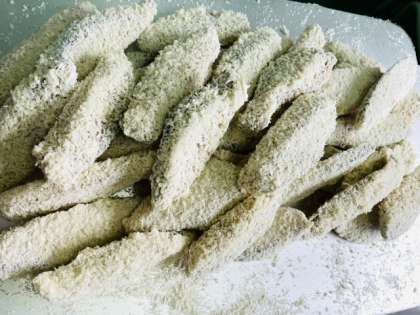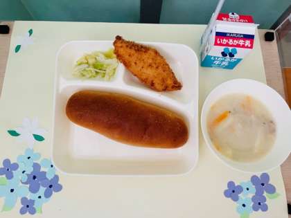 サーモンフライ、豆乳スープ、キャベツのソテー、黒糖パン、牛乳