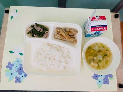 いわしてんぷら、五目汁、豚肉とさんどまめのいためもの、ごはん、牛乳