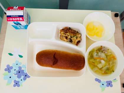 カレードリア、豚肉とキャベツのスープ、りんご(カット缶)、黒糖パン、牛乳