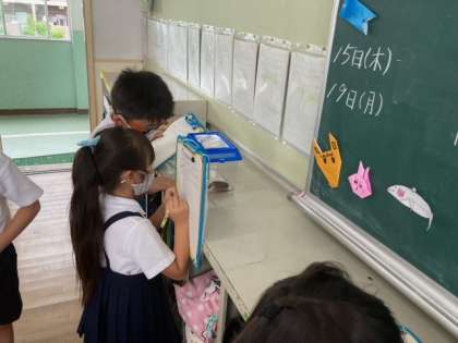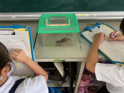 2年生がザリガニを観察しています。爪や体の特徴をよく見て観察記録をとりました。もっと大きく育つといいなあ。