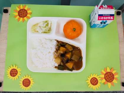 夏野菜のカレーライス、キャベツのサラダ、みかん(冷)、牛乳