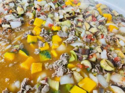 給食室で夏野菜のカレーライスを作っているようすです。牛肉、かぼちゃ、たまねぎ、なす、トマト(缶)、ピーマン、セロリが入っています。