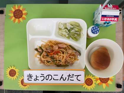 チキントマトスパゲッティ、グリーンアスパラガスとキャベツのサラダ、パン(1/2)、牛乳、発酵乳