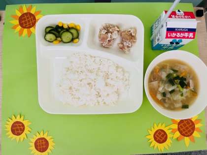 鶏肉のからあげ、中華みそスープ、きゅうりとコーンの甘酢あえ、ごはん、牛乳